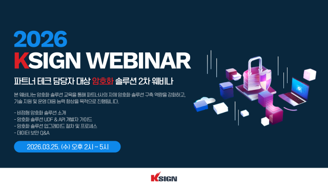 정보보안 전문기업 케이사인(대표 구자동·최현철)은 '2026 케이사인 파트너 테크 담당자 대상 암호화 솔루션 2차 웨비나'를 개최한다고 밝혔습니다. 웨비나는 3월 25일 오후 2시부터 5시까지 약 3시간 동안 진행됩니다.