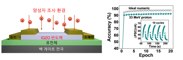 연구팀은 차세대 반도체 물질인 인듐-갈륨-아연 산화물 기반 시냅틱 트랜지스터(뇌의 시냅스를 모방한 AI 연산 소자)를 제작해 우주 환경에서의 AI 반도체 활용 가능성을 검증했습니다. 원자력연의 양성자가속기를 이용해 33MeV급 고에너지 양성자 빔을 소자에 조사했으며, 방사선량은 지구 저궤도 수준의 우주 방사선에 20년 이상 노출된 것과 같은 수준으로 설정했습니다.